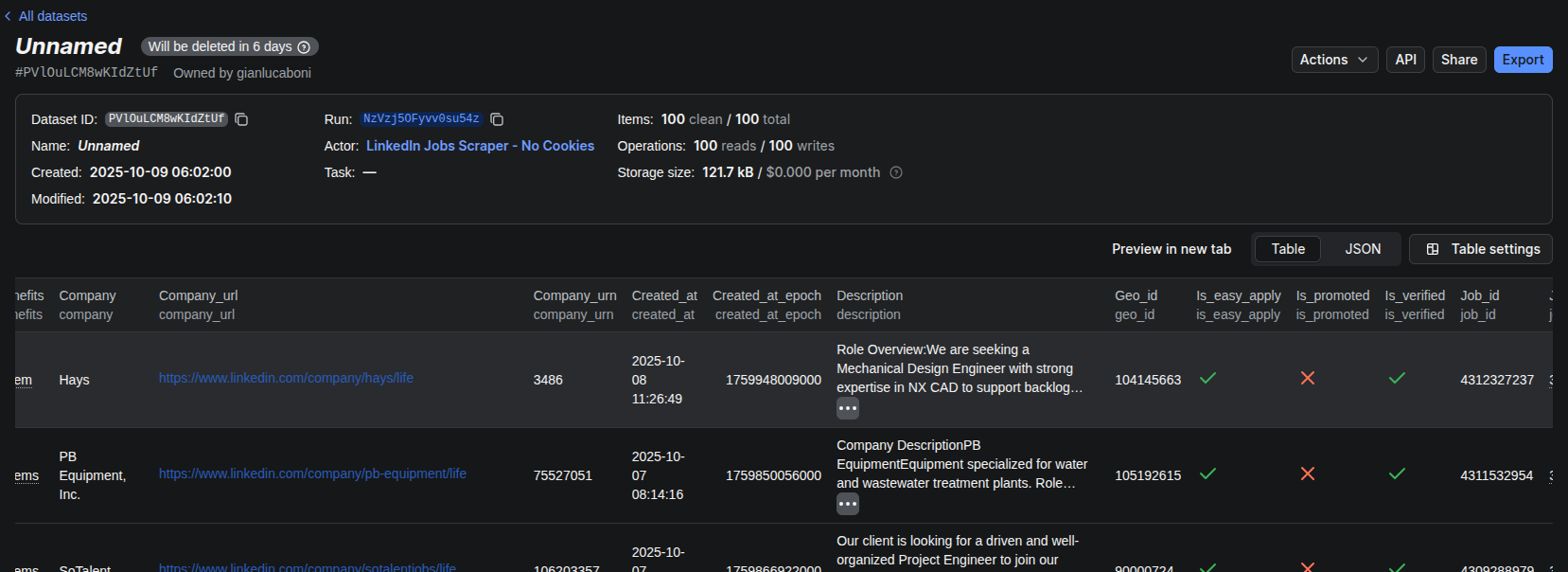 Apify is a web scraping and automation platform that allows you to collect data from websites without building everything from scratch, thanks to the so-called actors. Their pricing is quite flexible, ranging from a free tier with limited runs to paid plans starting around $49/month. Among their ready-to-use tools, the LinkedIn Jobs Scraper - No Cookies actor was exactly what I was looking for! What you have to do is just to fill a form with the filter you want to apply for your search, and by simply clicking on Start, items will be collected and saved on the platform storage, organised in datasets.