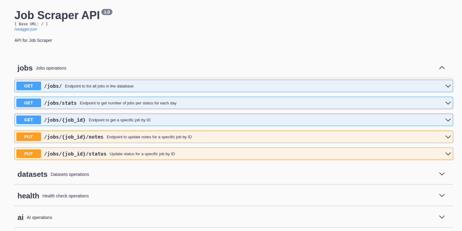 /healthjust to check if the API is alive,/datasetsto sync new job data from Apify,/jobsto manage my job entries,- and