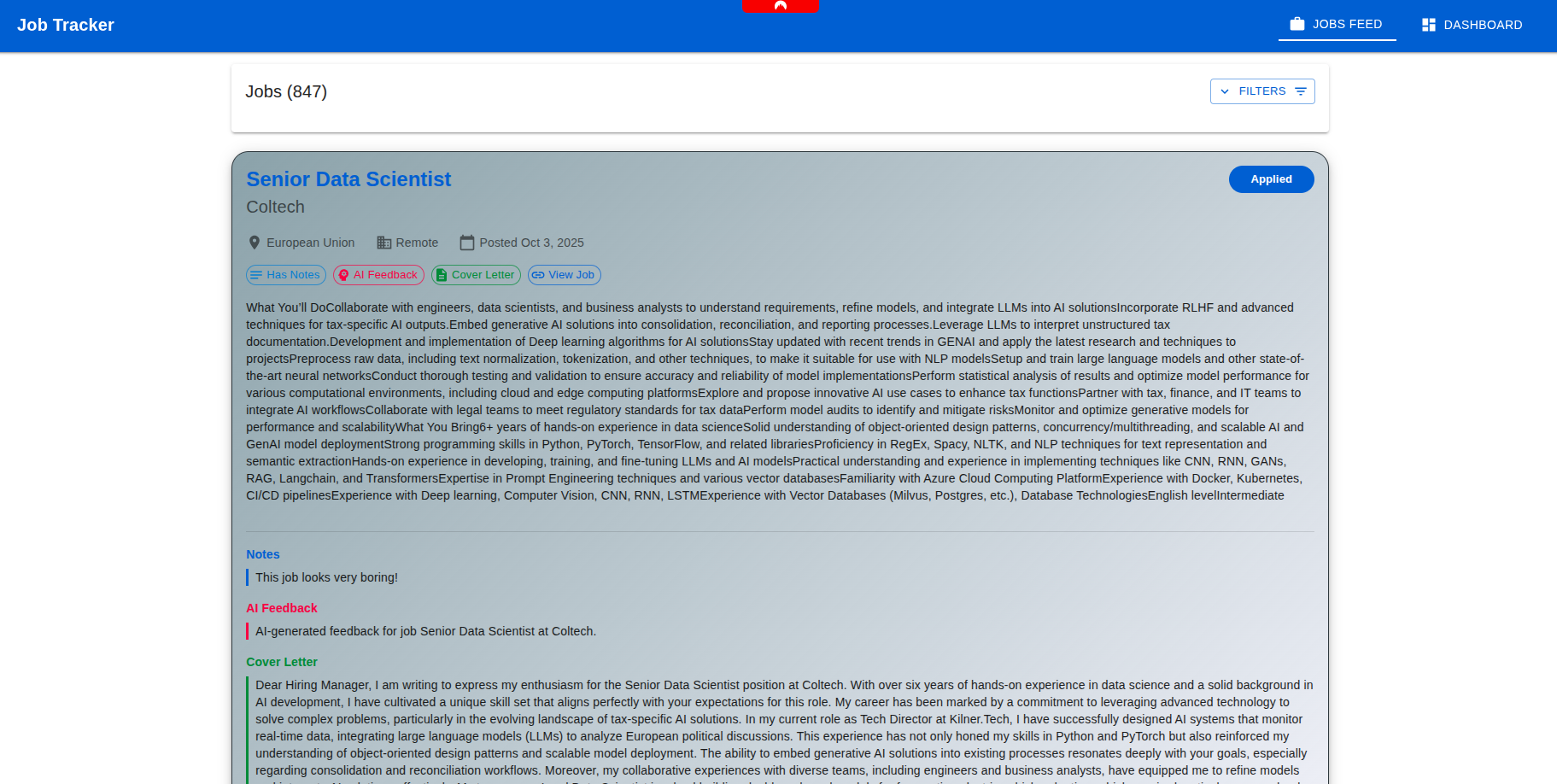 So, moving past my little rant, and fueled by curiosity (and a bit of fun with AI), I built a simple desktop app to track job applications and automatically generate cover letters using today’s infamous LLMs. Beyond just creating letters - yes, no copy-and-paste required, because apparently energy-saving standards don’t include that - the system also gives feedback on how your skills and interests match each job. Let’s dive in!