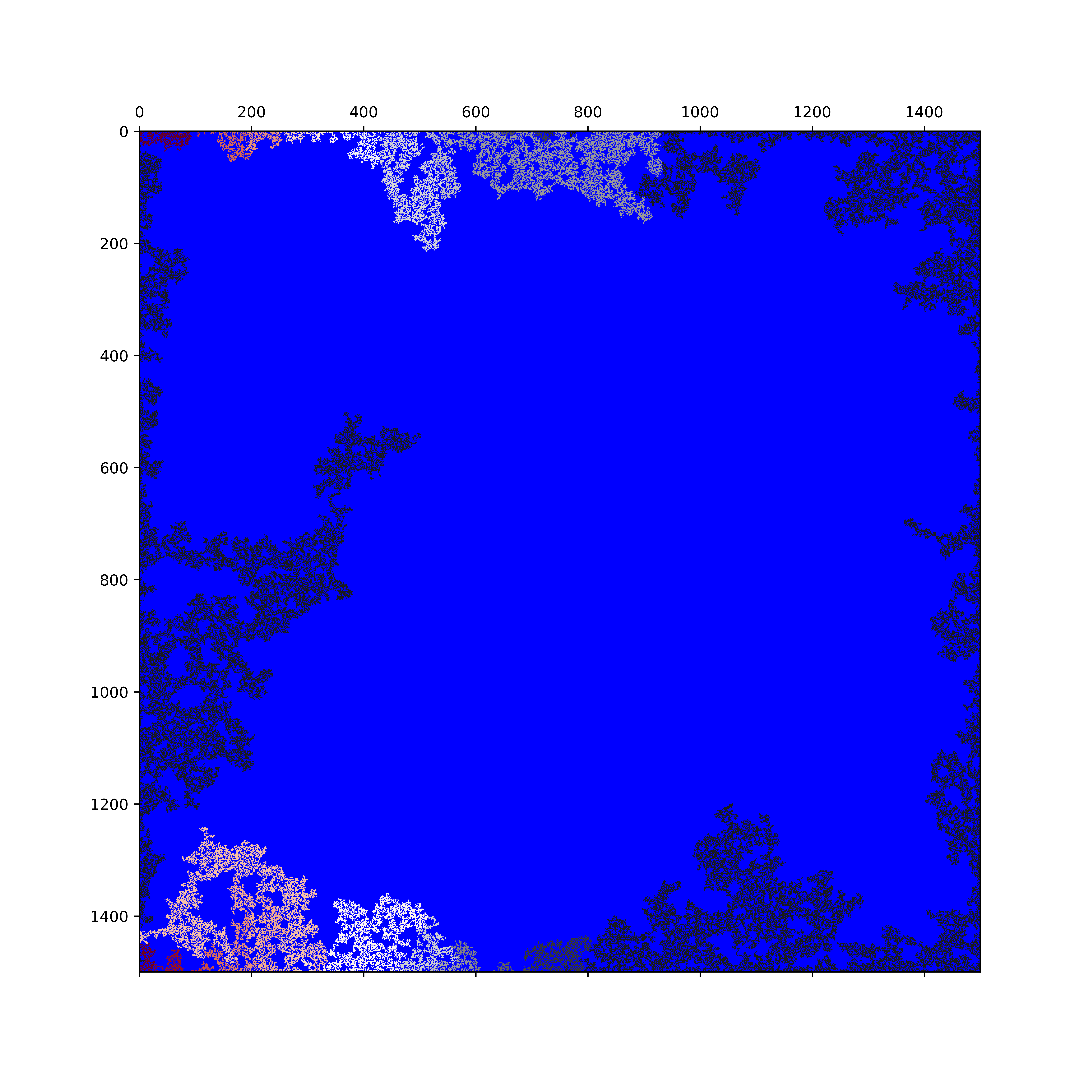 In the case of the average number of clusters, we can conclude that if we zoom in on the system with a lens, i.e., we reduce the scale of the system, we would see the same invariant picture. You can interact with the plot below, which displays the system in proximity to the criticality. Try exploring the fractal structure by observing the holes left by the biggest clusters, which are populated by smaller clusters.
