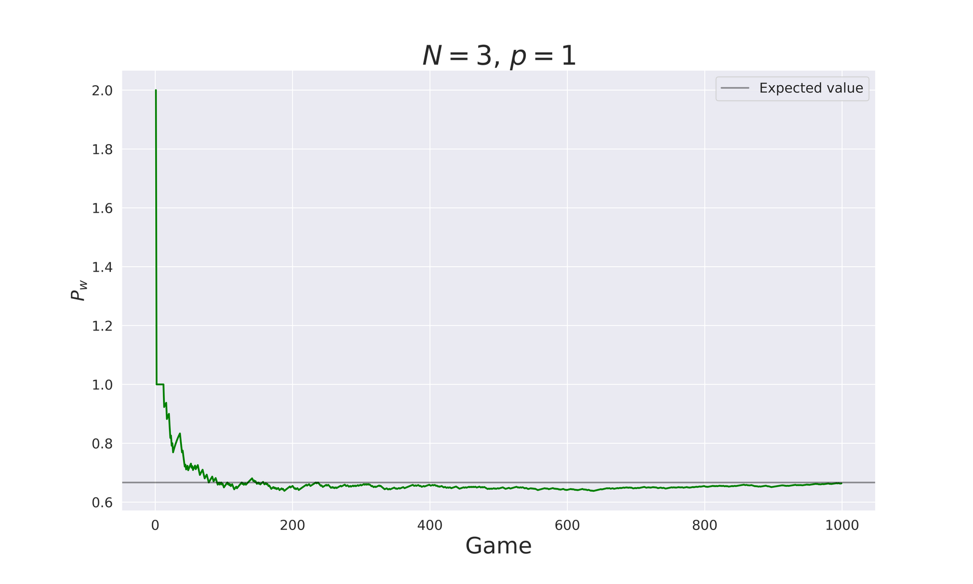 for the probability of winning by changing the door. For $N=3$ and $p=1$ we have $P_{w}(3,1)=\frac{2}{3}$, and this is exactly what is shown in the plot below. We see that if we repeat the game many times, and for each simulation we take track of the winning, the ratio $\frac{win}{games}$ approaches the expected value.
