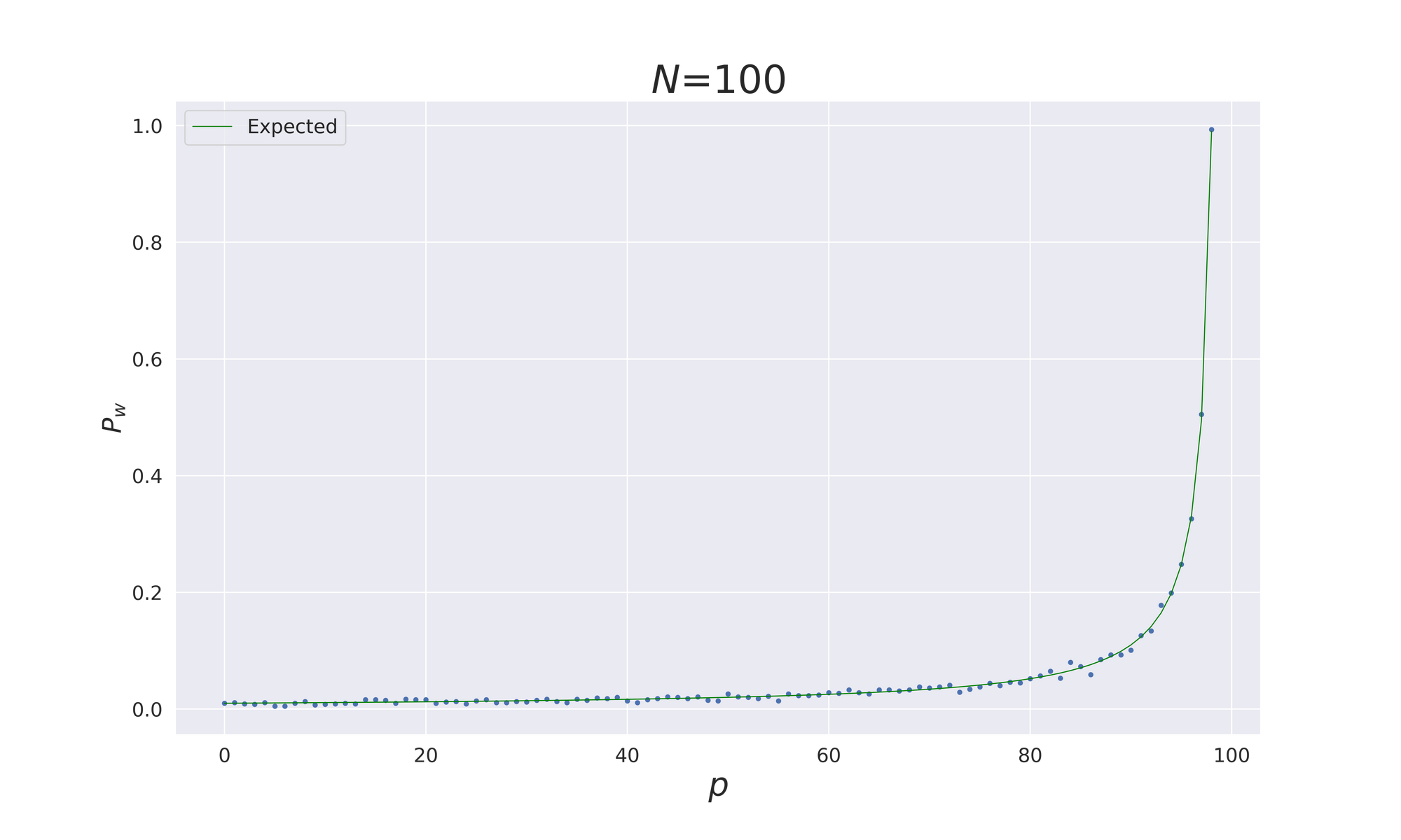 In the plot below is shown $P_{w}(N=100,p)$ as function of $p$. The small dots are given by computing the ratio $\frac{win}{games}$ after iterating each process 1000 times, the green continuous line is the expected behaviour.